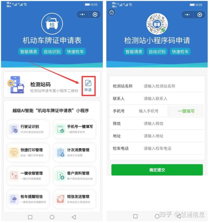 关注机动车牌证申请表小程序,点击检测站码申请,填写检测站的基本信息,点击确定提交,稍后将会有工作人员通过185-010-70599与您联络,开通检测站码事宜; 如下图,为检测站码体验版,体验用户可打开微信扫码来体验“机动车牌证申请表小程序”用户界面。