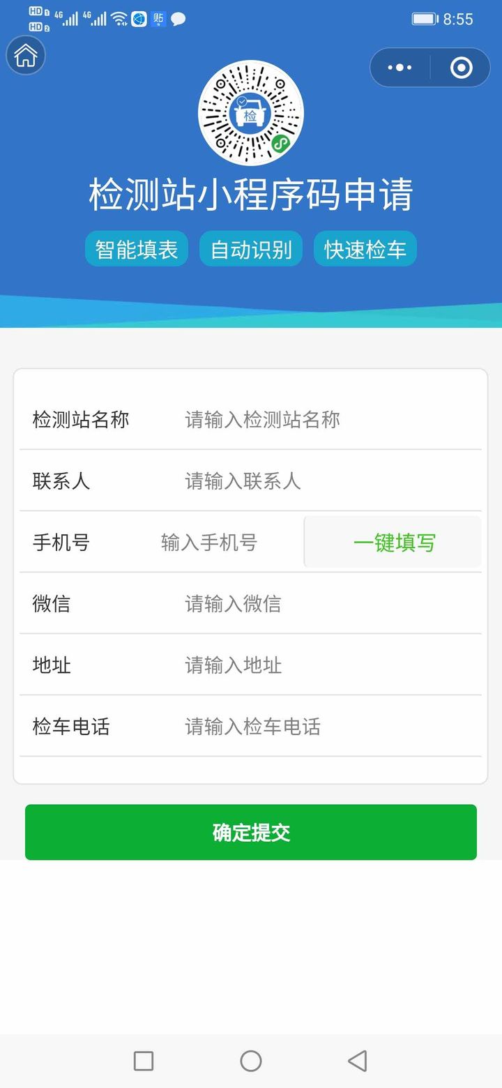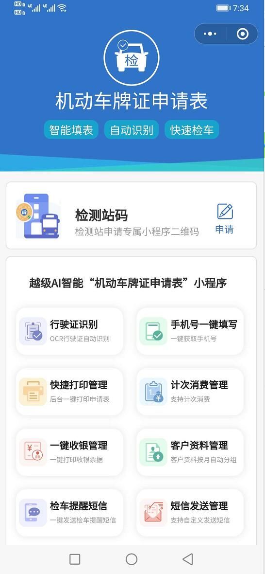 智能机动车牌证申请表小程序,旨在于为机动车检测站提供专属“机动车牌证申请表”检测站小程序场所码,机动车检测站通过小程序申请专属场所小程序码,并张贴到检测站明显位置,供检车用户扫描填写机动车牌证申请表,系统支持OCR行驶证自动识别技术、手机号自动获取,减少填表过程中的误差、提高填表效率,产品分为前端小程序与小程序智能管理后台两部分。
