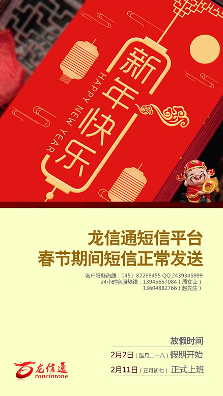 上一篇:2019年春节放假通知:龙信通短信平台,春节期间短信正常发送