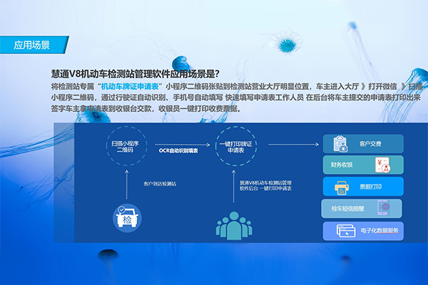 慧通V8机动车检测站管理软件由“机动车牌证申请表小程序+慧通V8管理后台”两部分组成,通过慧通V8机动车检测站管理软件后台生成检测站将专属“机动车牌证申请表”小程序二维码,张贴到检测站营业大厅明显位置,车主进入大厅-打开微信 -扫描小程序二维码,通过行驶证OCR自动识别、手机号自动填写,快速填写申请表工作人员在慧通V8管理后台将车主提交的申请表打印出来签字车主拿申请表到收银台交款,收银员一键打印收费票据。