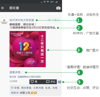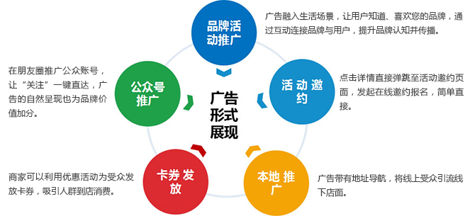 朋友圈广告通过微信广告系统进行投放和管理,广告本身内容将基于微信公众账号生态体系,以类似朋友的原创内容形式进行展现, 在基于微信用户画像进行定向的同时,依托关系链进行互动传播。